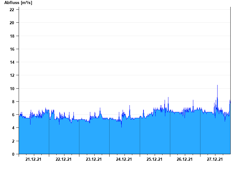 Messwerte beeinflusst durch Kraftwerkssteuerung und Kiesumlagerungen. Kiesanlandungen können bei Niedrigwasser Trockenlegung der Messinstrumente bewirken.