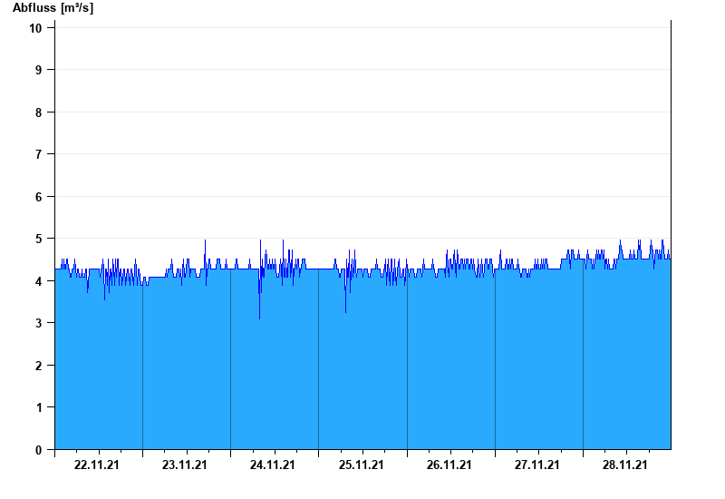 Messwerte beeinflusst durch Kraftwerkssteuerung und Kiesumlagerungen. Kiesanlandungen können bei Niedrigwasser Trockenlegung der Messinstrumente bewirken.