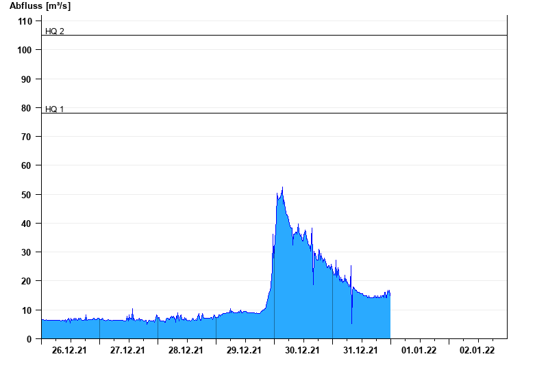 Messwerte beeinflusst durch Kraftwerkssteuerung und Kiesumlagerungen. Kiesanlandungen können bei Niedrigwasser Trockenlegung der Messinstrumente bewirken.