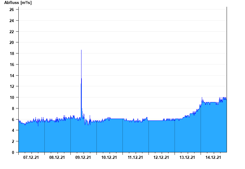 Messwerte beeinflusst durch Kraftwerkssteuerung und Kiesumlagerungen. Kiesanlandungen können bei Niedrigwasser Trockenlegung der Messinstrumente bewirken.