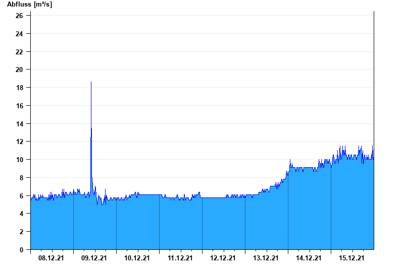 Messwerte beeinflusst durch Kraftwerkssteuerung und Kiesumlagerungen. Kiesanlandungen können bei Niedrigwasser Trockenlegung der Messinstrumente bewirken.