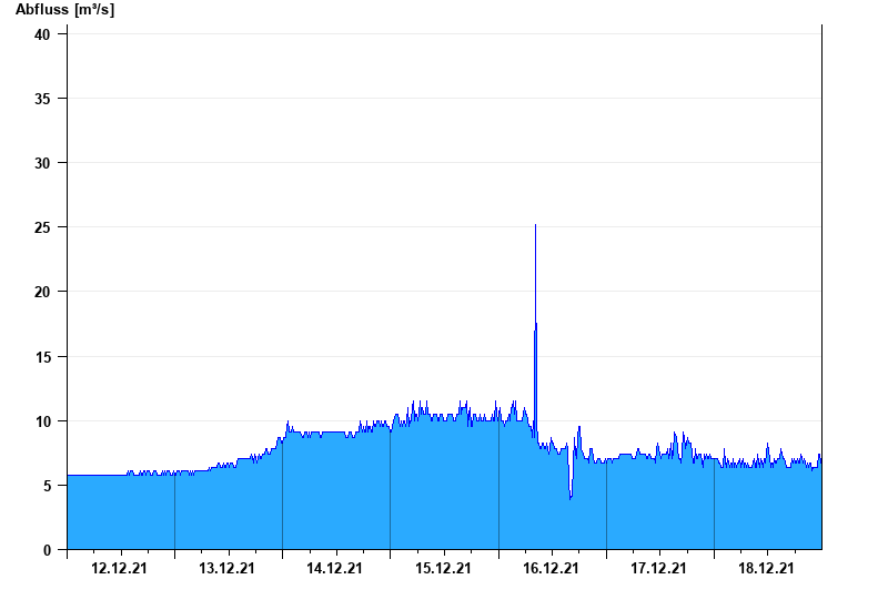 Messwerte beeinflusst durch Kraftwerkssteuerung und Kiesumlagerungen. Kiesanlandungen können bei Niedrigwasser Trockenlegung der Messinstrumente bewirken.