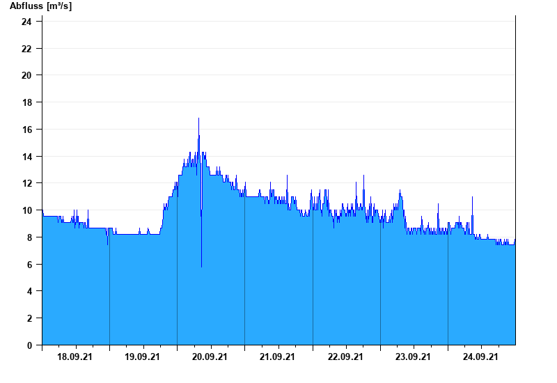 Messwerte beeinflusst durch Kraftwerkssteuerung und Kiesumlagerungen. Kiesanlandungen können bei Niedrigwasser Trockenlegung der Messinstrumente bewirken.