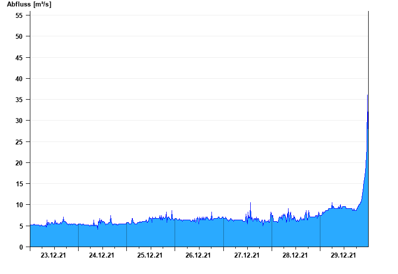 Messwerte beeinflusst durch Kraftwerkssteuerung und Kiesumlagerungen. Kiesanlandungen können bei Niedrigwasser Trockenlegung der Messinstrumente bewirken.