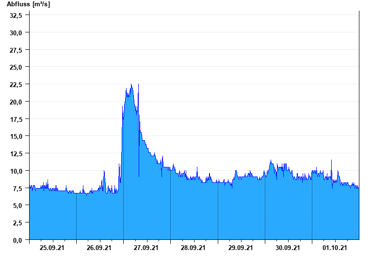 Messwerte beeinflusst durch Kraftwerkssteuerung und Kiesumlagerungen. Kiesanlandungen können bei Niedrigwasser Trockenlegung der Messinstrumente bewirken.