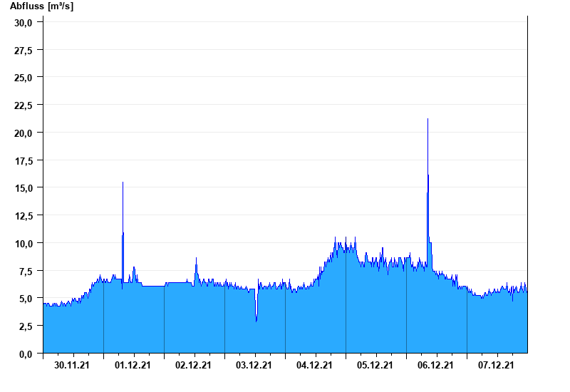 Messwerte beeinflusst durch Kraftwerkssteuerung und Kiesumlagerungen. Kiesanlandungen können bei Niedrigwasser Trockenlegung der Messinstrumente bewirken.