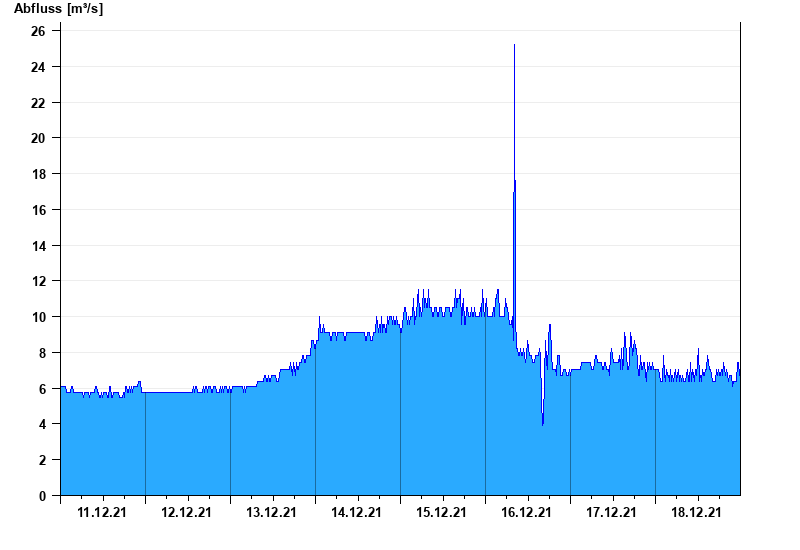 Messwerte beeinflusst durch Kraftwerkssteuerung und Kiesumlagerungen. Kiesanlandungen können bei Niedrigwasser Trockenlegung der Messinstrumente bewirken.
