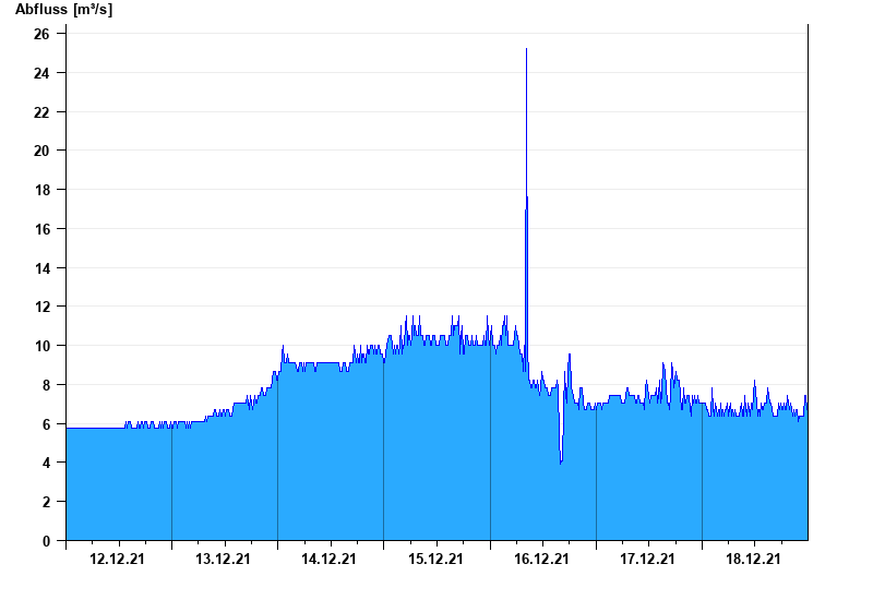 Messwerte beeinflusst durch Kraftwerkssteuerung und Kiesumlagerungen. Kiesanlandungen können bei Niedrigwasser Trockenlegung der Messinstrumente bewirken.