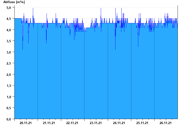 Messwerte beeinflusst durch Kraftwerkssteuerung und Kiesumlagerungen. Kiesanlandungen können bei Niedrigwasser Trockenlegung der Messinstrumente bewirken.