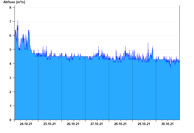 Messwerte beeinflusst durch Kraftwerkssteuerung und Kiesumlagerungen. Kiesanlandungen können bei Niedrigwasser Trockenlegung der Messinstrumente bewirken.