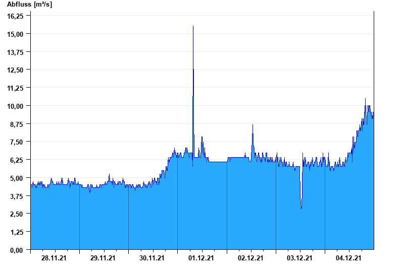 Messwerte beeinflusst durch Kraftwerkssteuerung und Kiesumlagerungen. Kiesanlandungen können bei Niedrigwasser Trockenlegung der Messinstrumente bewirken.