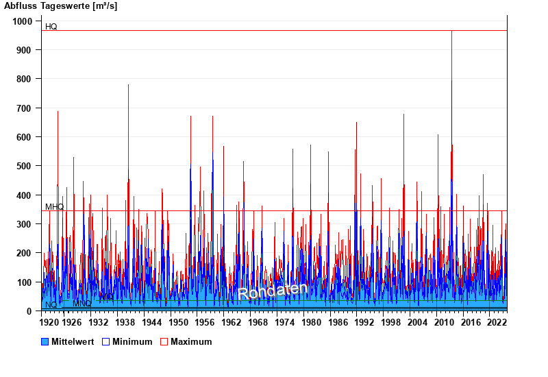Discharge from 01.11.1920 to 16.12.2025| Date | Mean value [m³/s] | Maximum [m³/s] | Minimum [m³/s] |