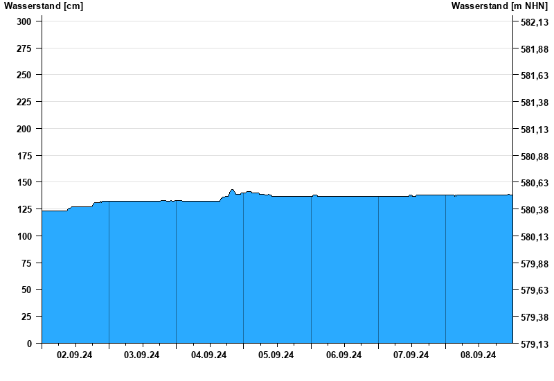 Der Pegel wird durch Baumaßnahmen unterhalb beeinflusst (Rückstau). Entsprechend sind die Abflusswerte nicht korrekt