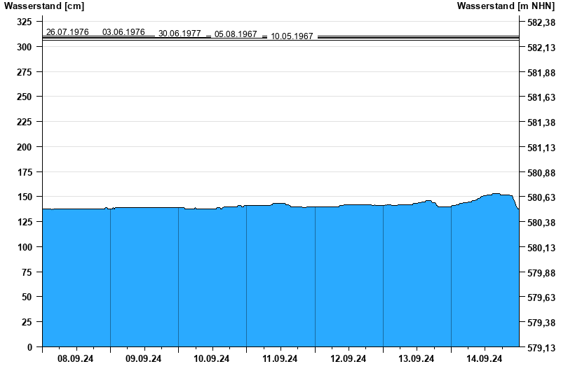 Der Pegel wird durch Baumaßnahmen unterhalb beeinflusst (Rückstau). Entsprechend sind die Abflusswerte nicht korrekt