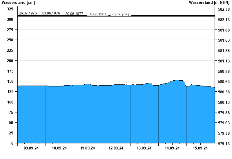 Der Pegel wird durch Baumaßnahmen unterhalb beeinflusst (Rückstau). Entsprechend sind die Abflusswerte nicht korrekt