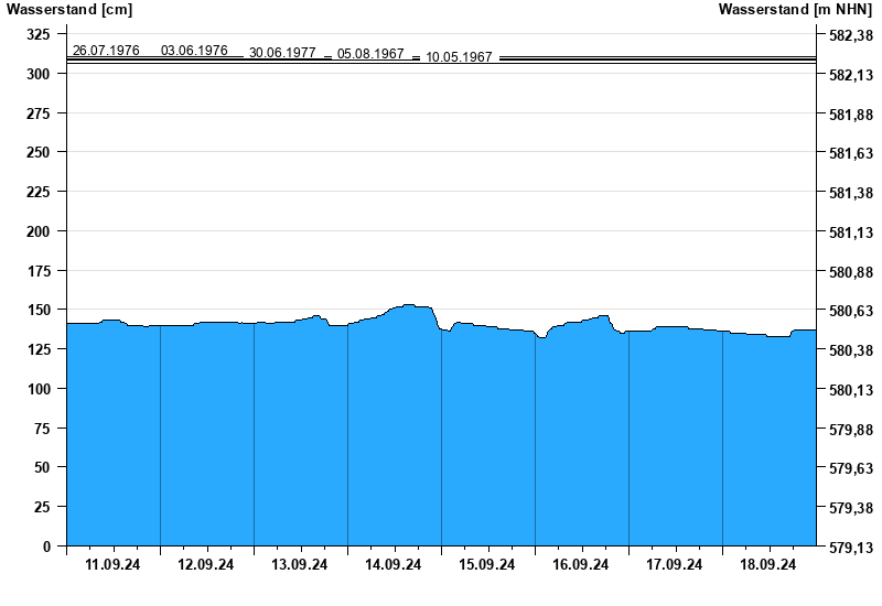 Der Pegel wird durch Baumaßnahmen unterhalb beeinflusst (Rückstau). Entsprechend sind die Abflusswerte nicht korrekt