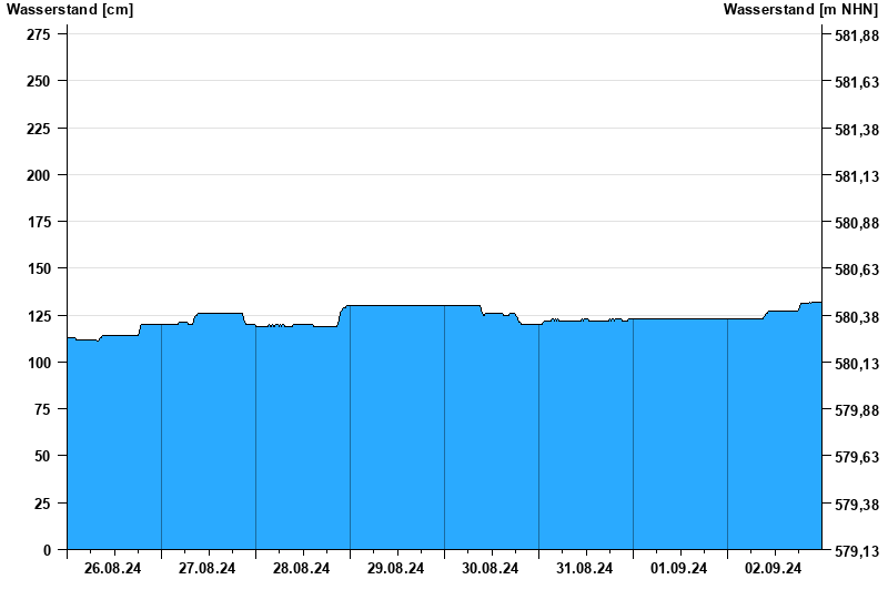 Der Pegel wird durch Baumaßnahmen unterhalb beeinflusst (Rückstau). Entsprechend sind die Abflusswerte nicht korrekt