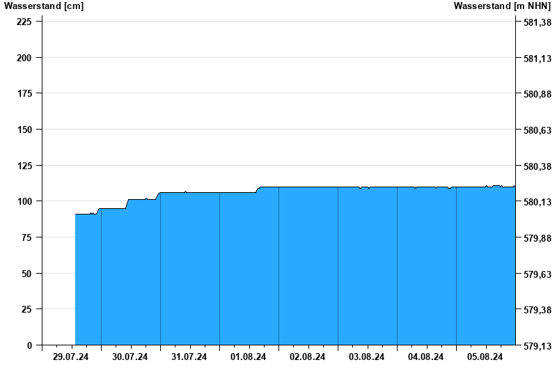 Der Pegel wird durch Baumaßnahmen unterhalb beeinflusst (Rückstau). Entsprechend sind die Abflusswerte nicht korrekt