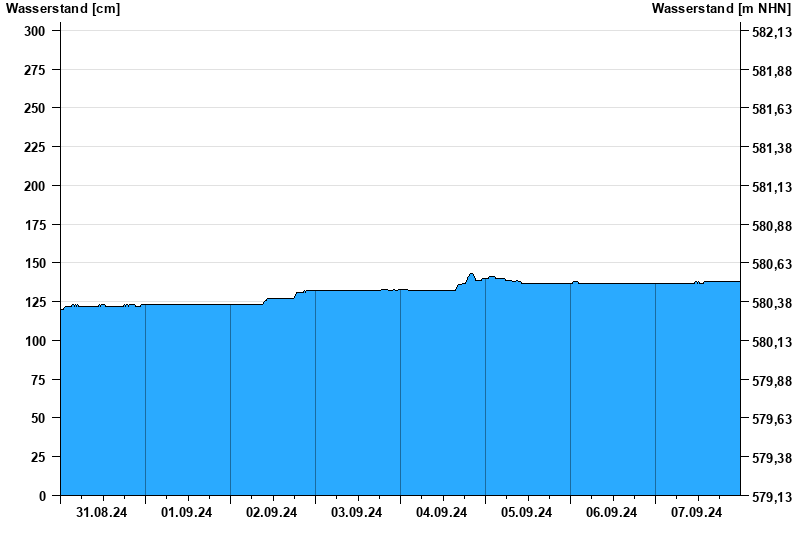 Der Pegel wird durch Baumaßnahmen unterhalb beeinflusst (Rückstau). Entsprechend sind die Abflusswerte nicht korrekt