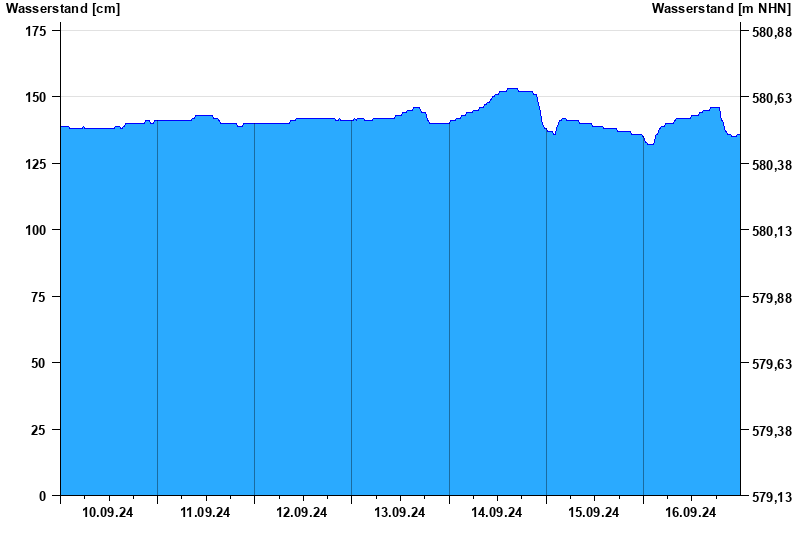 Der Pegel wird durch Baumaßnahmen unterhalb beeinflusst (Rückstau). Entsprechend sind die Abflusswerte nicht korrekt