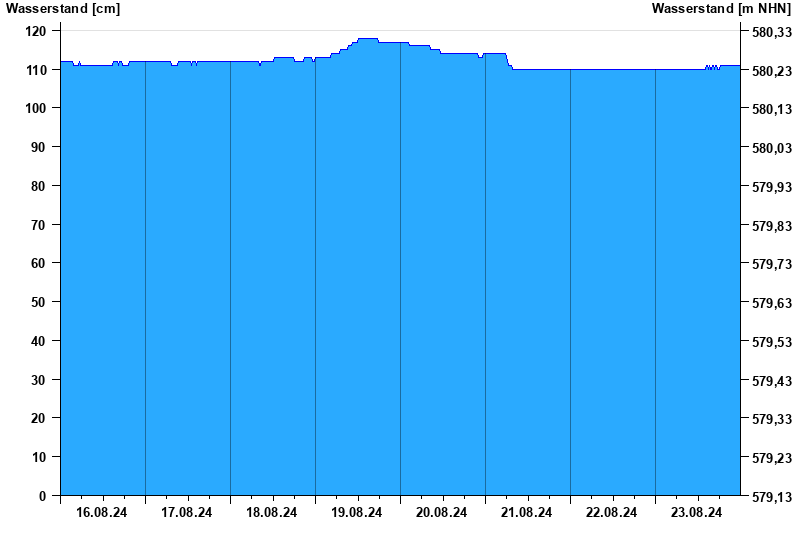 Der Pegel wird durch Baumaßnahmen unterhalb beeinflusst (Rückstau). Entsprechend sind die Abflusswerte nicht korrekt