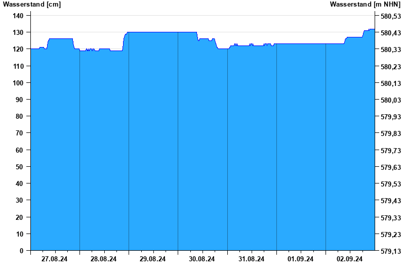 Der Pegel wird durch Baumaßnahmen unterhalb beeinflusst (Rückstau). Entsprechend sind die Abflusswerte nicht korrekt