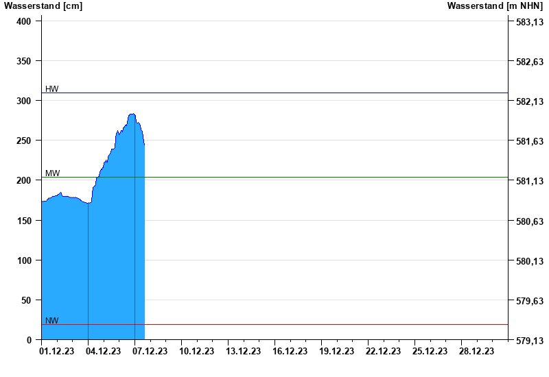 Der Pegel wird durch Baumaßnahmen unterhalb beeinflusst (Rückstau). Entsprechend sind die Abflusswerte nicht korrekt