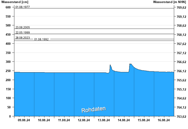 Störung wegen Stromversorgungsprobleme. Der Wasserstand wird durch starke Kiesumlagerungen beeinflusst. Der hier gezeigte Abfluss kann entsprechend stark vom tatsächlichen Abfluss abweichen.