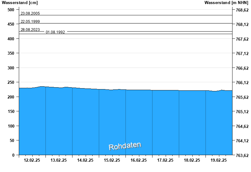 Störung wegen Stromversorgungsprobleme. Der Wasserstand wird durch starke Kiesumlagerungen beeinflusst. Der hier gezeigte Abfluss kann entsprechend stark vom tatsächlichen Abfluss abweichen.