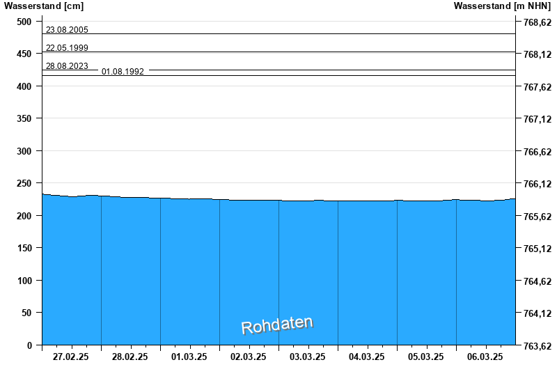 Störung wegen Stromversorgungsprobleme. Der Wasserstand wird durch starke Kiesumlagerungen beeinflusst. Der hier gezeigte Abfluss kann entsprechend stark vom tatsächlichen Abfluss abweichen.