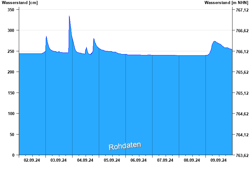 Störung wegen Stromversorgungsprobleme. Der Wasserstand wird durch starke Kiesumlagerungen beeinflusst. Der hier gezeigte Abfluss kann entsprechend stark vom tatsächlichen Abfluss abweichen.