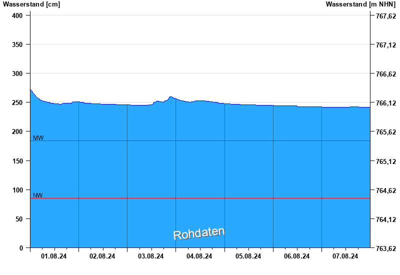 Störung wegen Stromversorgungsprobleme. Der Wasserstand wird durch starke Kiesumlagerungen beeinflusst. Der hier gezeigte Abfluss kann entsprechend stark vom tatsächlichen Abfluss abweichen.