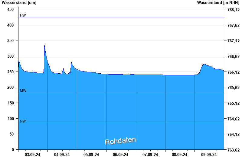Störung wegen Stromversorgungsprobleme. Der Wasserstand wird durch starke Kiesumlagerungen beeinflusst. Der hier gezeigte Abfluss kann entsprechend stark vom tatsächlichen Abfluss abweichen.