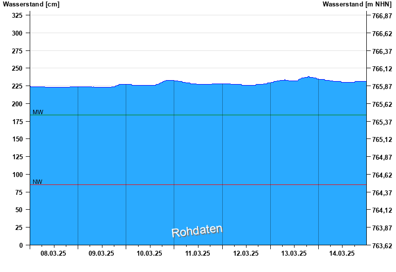 Störung wegen Stromversorgungsprobleme. Der Wasserstand wird durch starke Kiesumlagerungen beeinflusst. Der hier gezeigte Abfluss kann entsprechend stark vom tatsächlichen Abfluss abweichen.