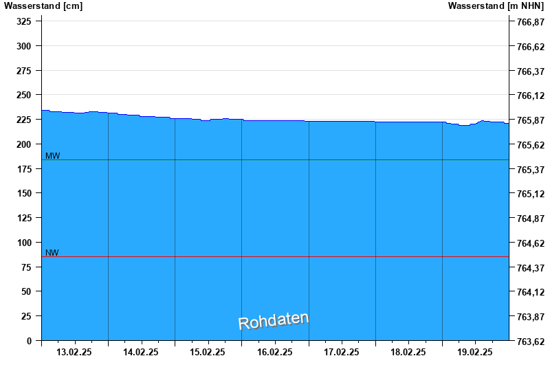 Störung wegen Stromversorgungsprobleme. Der Wasserstand wird durch starke Kiesumlagerungen beeinflusst. Der hier gezeigte Abfluss kann entsprechend stark vom tatsächlichen Abfluss abweichen.