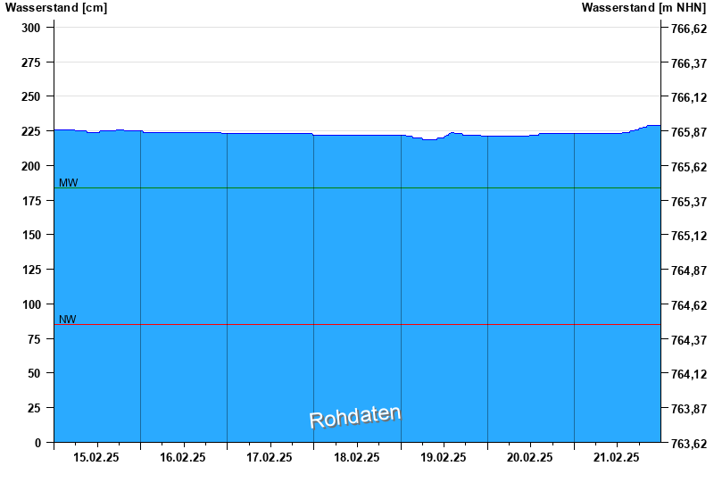 Störung wegen Stromversorgungsprobleme. Der Wasserstand wird durch starke Kiesumlagerungen beeinflusst. Der hier gezeigte Abfluss kann entsprechend stark vom tatsächlichen Abfluss abweichen.
