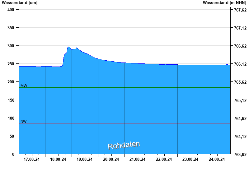 Störung wegen Stromversorgungsprobleme. Der Wasserstand wird durch starke Kiesumlagerungen beeinflusst. Der hier gezeigte Abfluss kann entsprechend stark vom tatsächlichen Abfluss abweichen.