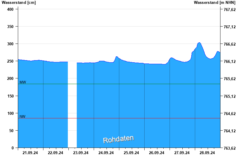 Störung wegen Stromversorgungsprobleme. Der Wasserstand wird durch starke Kiesumlagerungen beeinflusst. Der hier gezeigte Abfluss kann entsprechend stark vom tatsächlichen Abfluss abweichen.