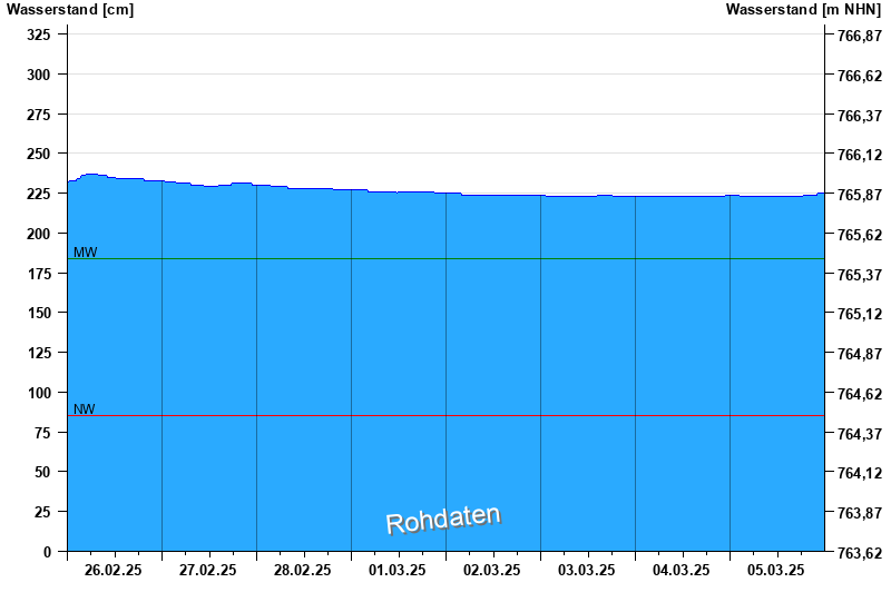 Störung wegen Stromversorgungsprobleme. Der Wasserstand wird durch starke Kiesumlagerungen beeinflusst. Der hier gezeigte Abfluss kann entsprechend stark vom tatsächlichen Abfluss abweichen.