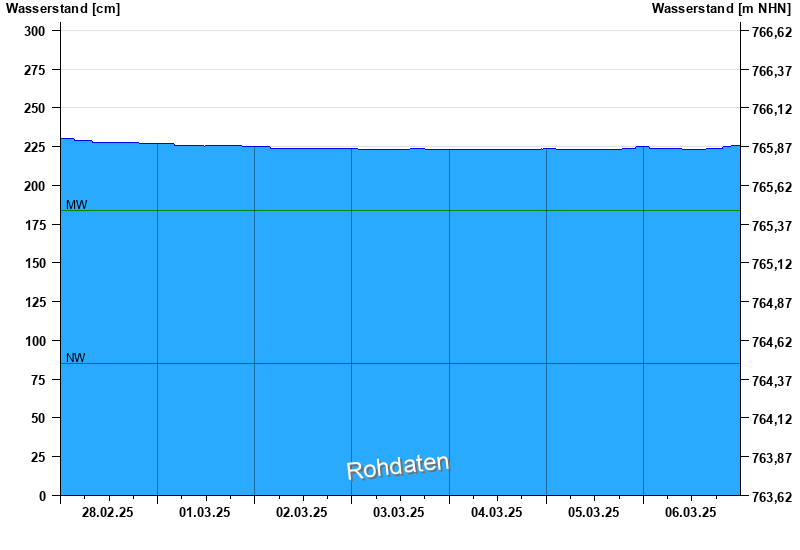 Störung wegen Stromversorgungsprobleme. Der Wasserstand wird durch starke Kiesumlagerungen beeinflusst. Der hier gezeigte Abfluss kann entsprechend stark vom tatsächlichen Abfluss abweichen.