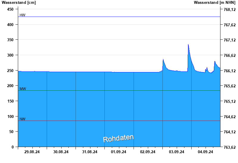 Störung wegen Stromversorgungsprobleme. Der Wasserstand wird durch starke Kiesumlagerungen beeinflusst. Der hier gezeigte Abfluss kann entsprechend stark vom tatsächlichen Abfluss abweichen.