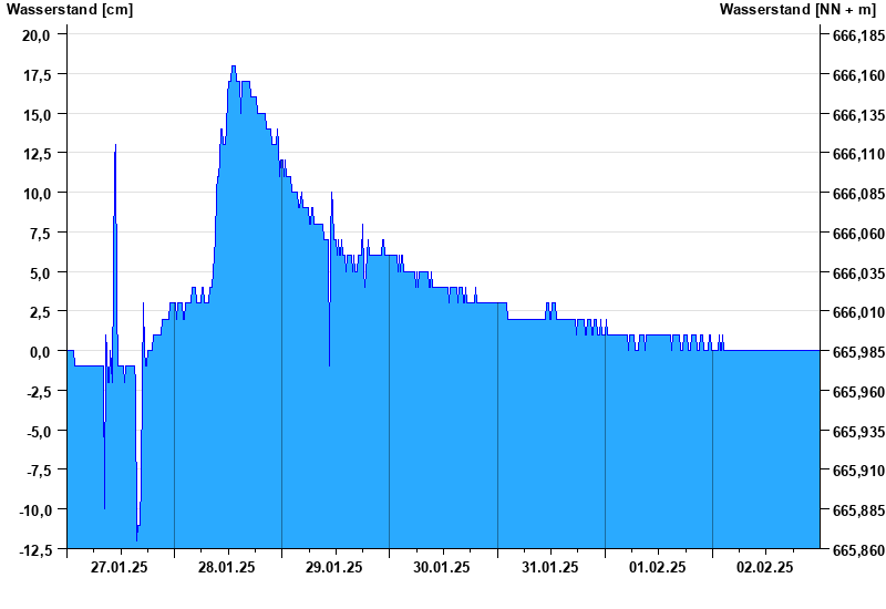 Messwerte beeinflusst durch Kraftwerkssteuerung und Kiesumlagerungen. Kiesanlandungen können bei Niedrigwasser Trockenlegung der Messinstrumente bewirken.