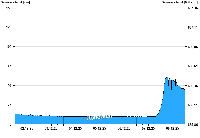 Messwerte beeinflusst durch Kraftwerkssteuerung und Kiesumlagerungen. Kiesanlandungen können bei Niedrigwasser Trockenlegung der Messinstrumente bewirken.