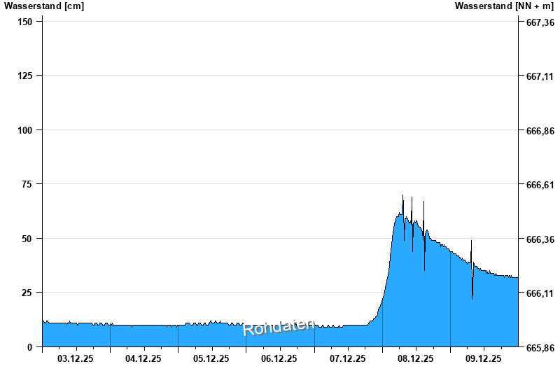Messwerte beeinflusst durch Kraftwerkssteuerung und Kiesumlagerungen. Kiesanlandungen können bei Niedrigwasser Trockenlegung der Messinstrumente bewirken.