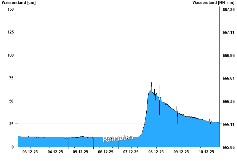 Messwerte beeinflusst durch Kraftwerkssteuerung und Kiesumlagerungen. Kiesanlandungen können bei Niedrigwasser Trockenlegung der Messinstrumente bewirken.