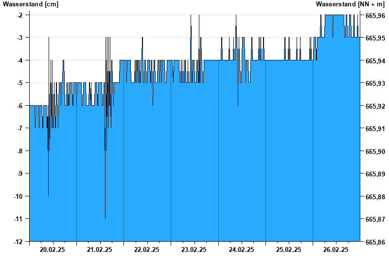 Messwerte beeinflusst durch Kraftwerkssteuerung und Kiesumlagerungen. Kiesanlandungen können bei Niedrigwasser Trockenlegung der Messinstrumente bewirken.