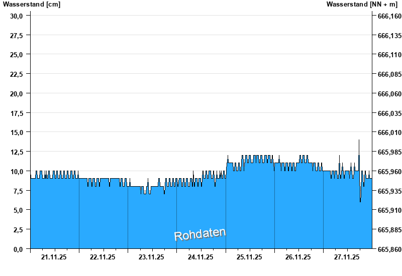 Messwerte beeinflusst durch Kraftwerkssteuerung und Kiesumlagerungen. Kiesanlandungen können bei Niedrigwasser Trockenlegung der Messinstrumente bewirken.