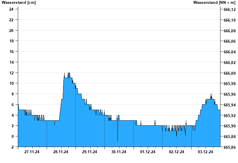 Messwerte beeinflusst durch Kraftwerkssteuerung und Kiesumlagerungen. Kiesanlandungen können bei Niedrigwasser Trockenlegung der Messinstrumente bewirken.