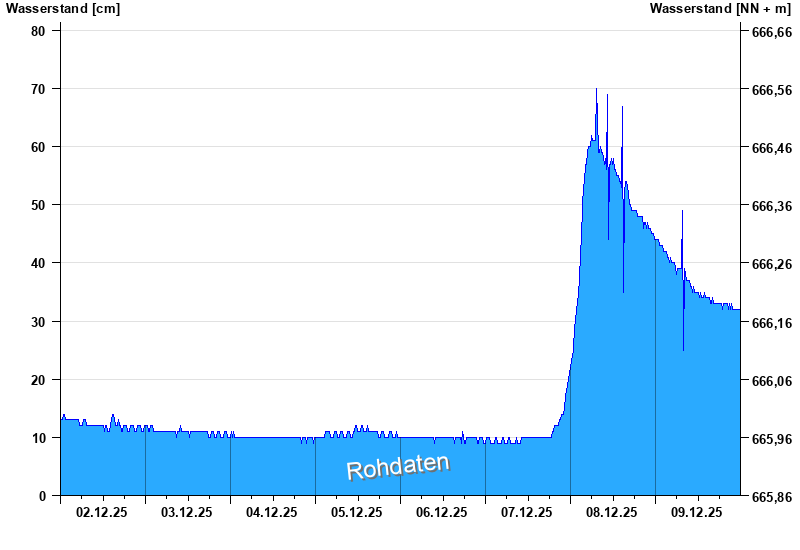 Messwerte beeinflusst durch Kraftwerkssteuerung und Kiesumlagerungen. Kiesanlandungen können bei Niedrigwasser Trockenlegung der Messinstrumente bewirken.