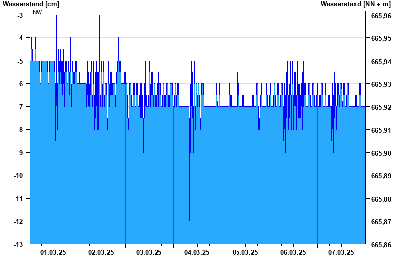 Messwerte beeinflusst durch Kraftwerkssteuerung und Kiesumlagerungen. Kiesanlandungen können bei Niedrigwasser Trockenlegung der Messinstrumente bewirken.